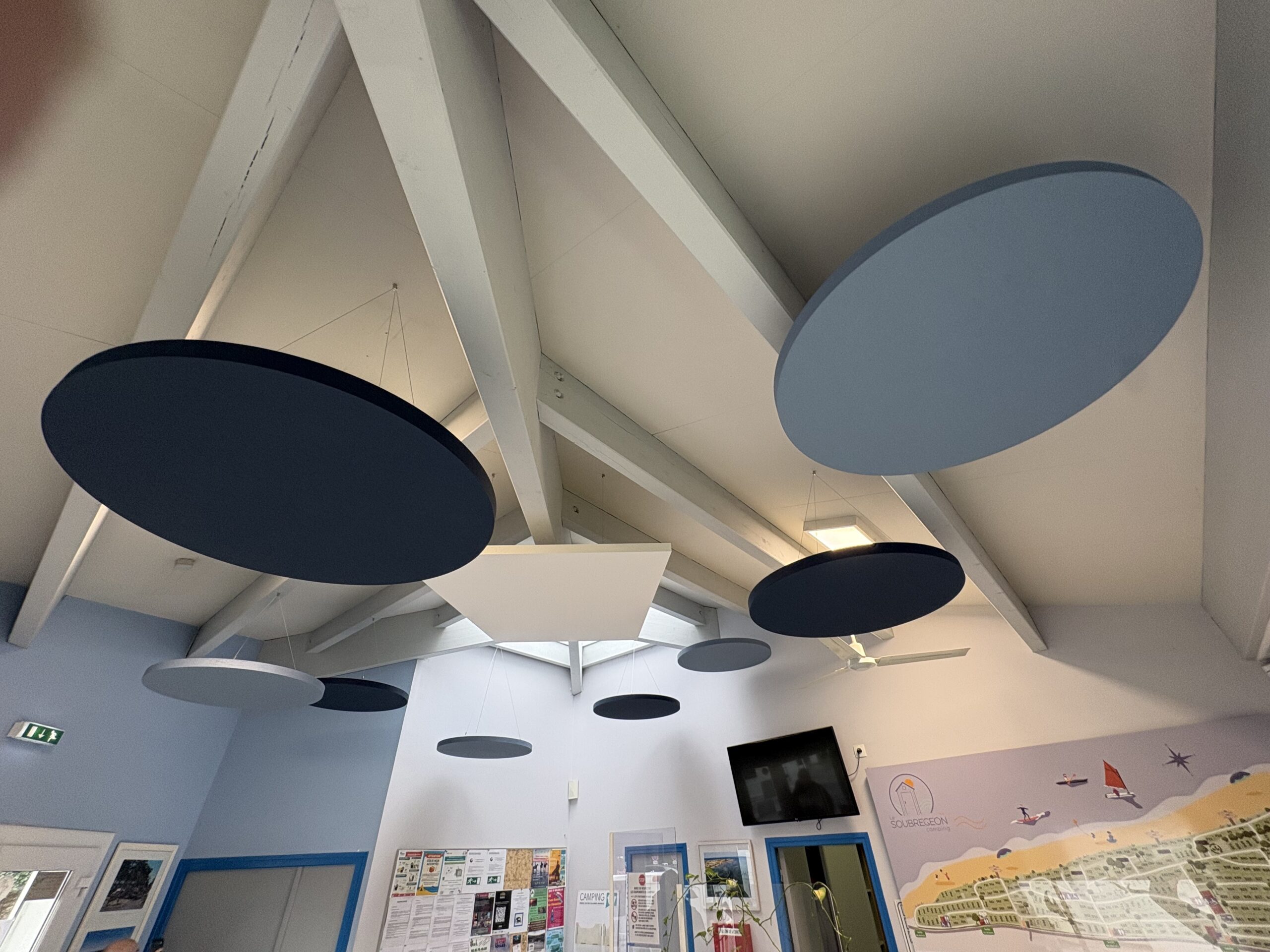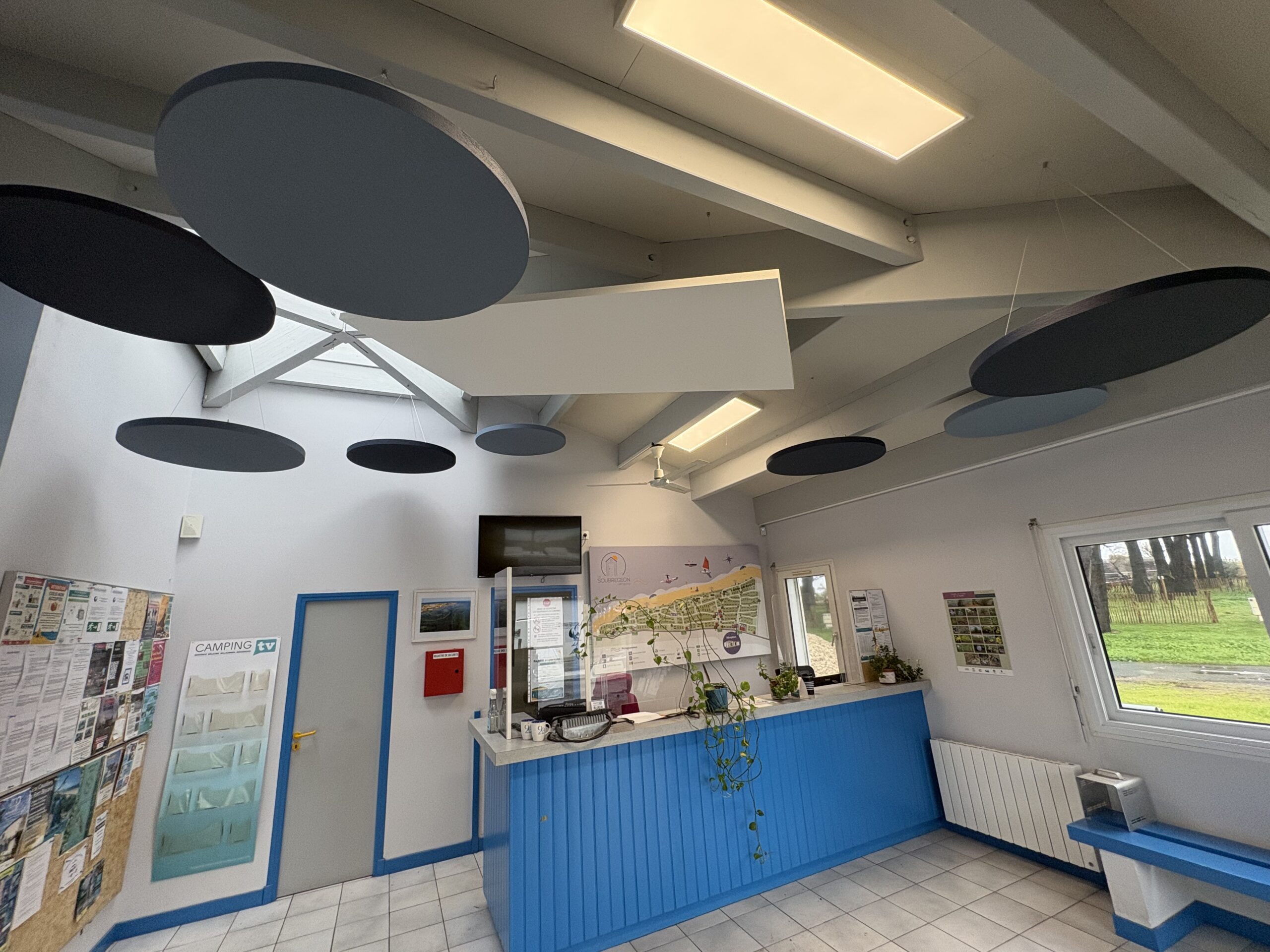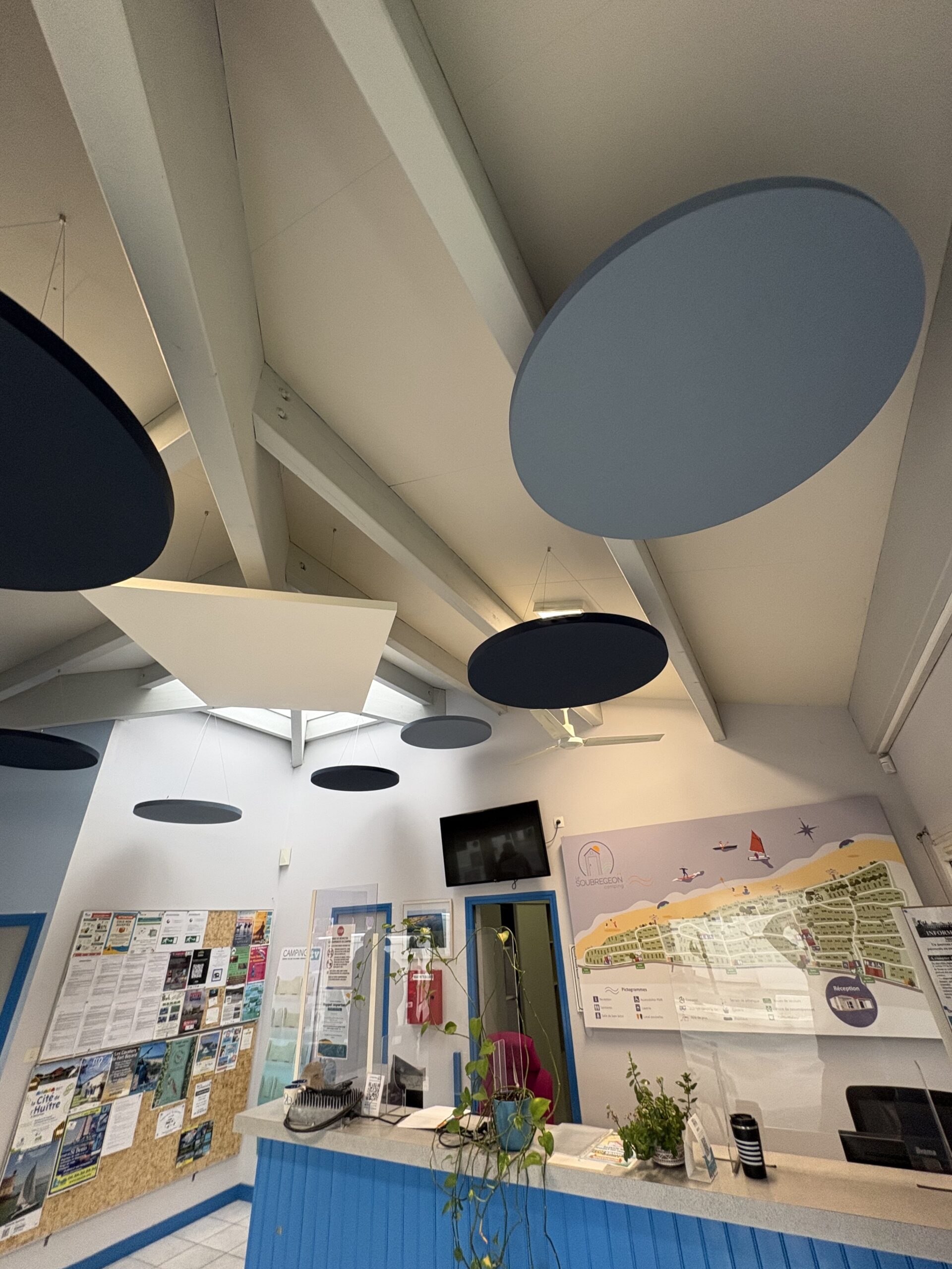 Problématique : Dans de ce camping à Saint Denis d’Oléron en Charente Maritime l’accueil est bruyante. Il y a un besoin en solution acoustique.