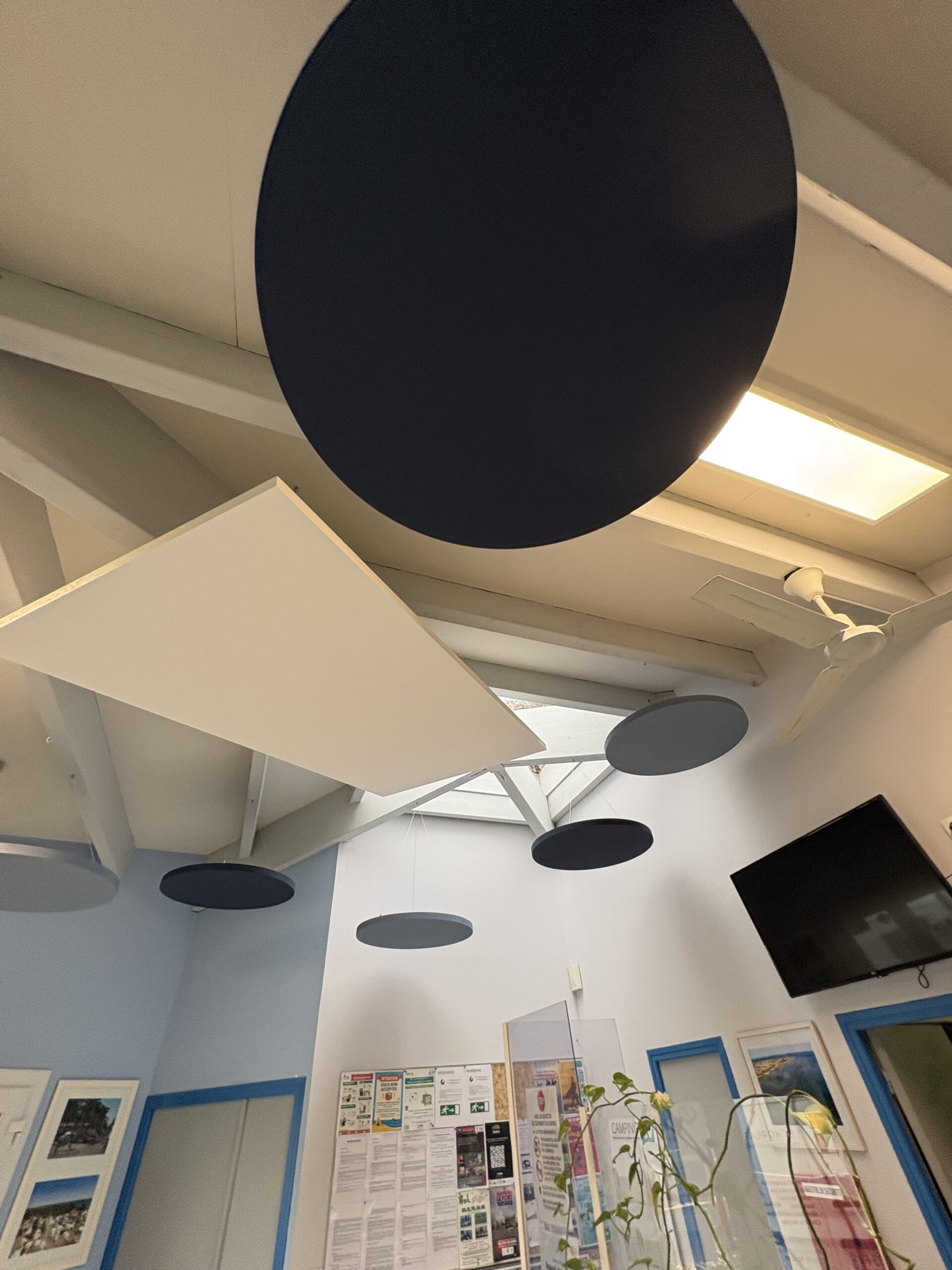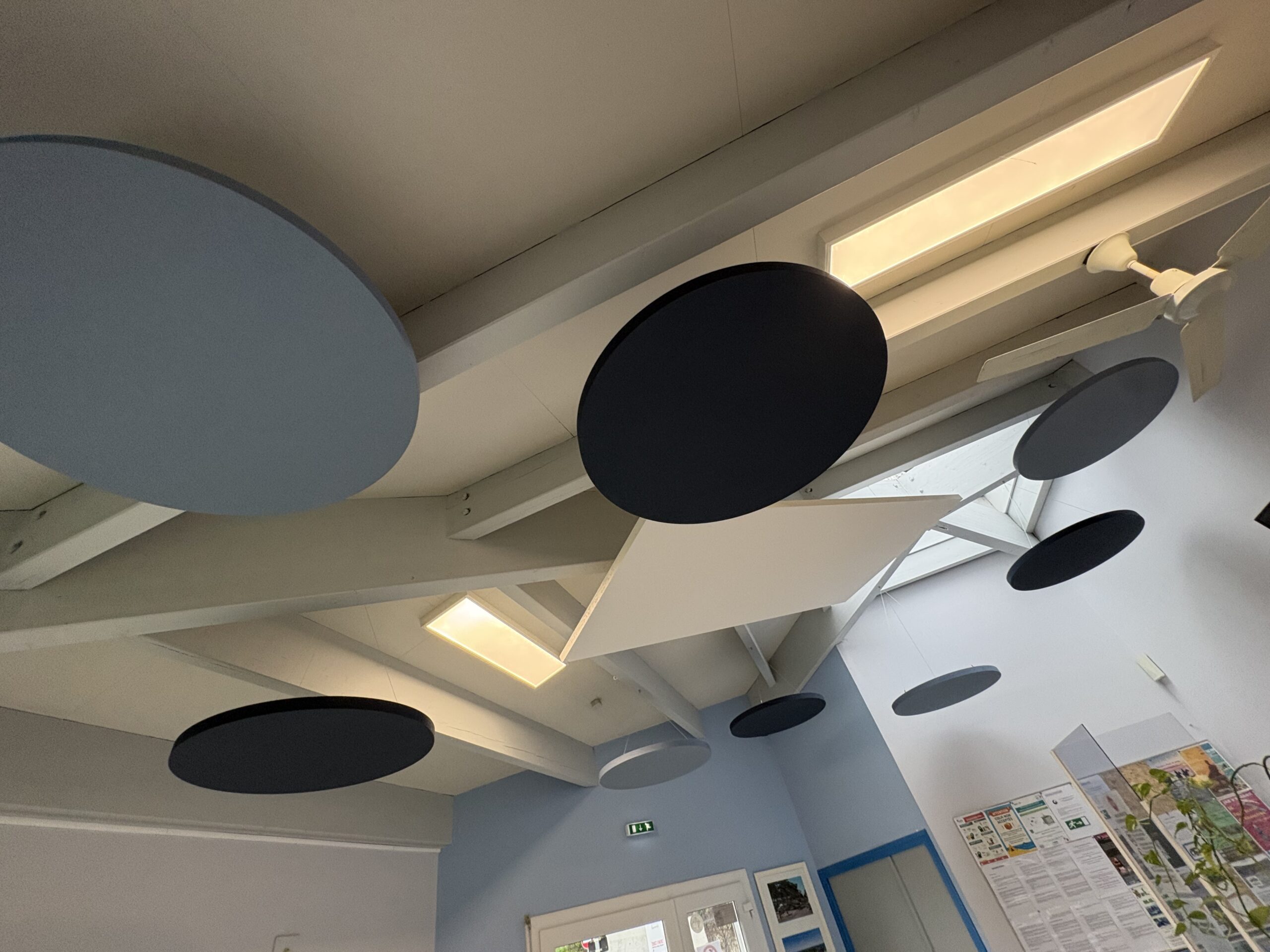 Solution : Nous avons posé 4 solos circle de diamètre 800 couleur Moonlight Sky, 4 solos circle de diamètre 800 couleur Ocean Storm et 1 solo rectangle 2400×1200 blanc de chez ECOPHON SAINT GOBAIN