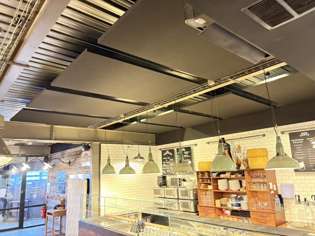 panneaux acoustiques muraux, îlots acoustiques suspendus, faux plafonds acoustiques et traitements ciblés des zones à forte réverbération.